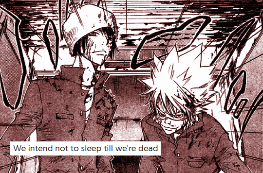 Yeah, it's easy to lean into the existing dark elements. It's part of what I enjoy most about KHR, that it has goofy + disturbing running all through it, though the balance shifts. But now I'm wondering which I find darker between the Kokuyo and Millefiore intros ... Kokuyo wins for being visceral, I think, while the Millefiore arc intro is more conceptually dark.